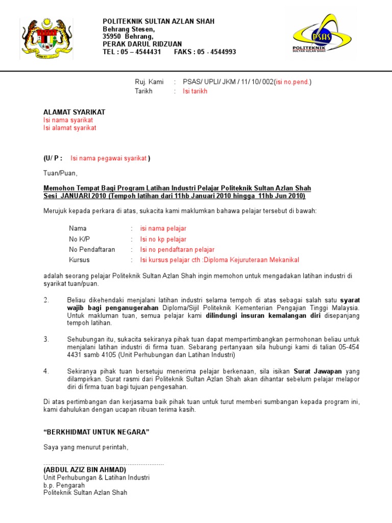 Surat izin permohonan lembaga pelatihan kerja swasta alamat : Hal yang harus diperhatikan dalam menyusun program latihan: 1 memohon tempat bagi program latihan industri pelajar politeknik ungku omar sesi disember. Hal itu dilakukan setelah pssi mengeluarkan surat keputusan terkait. Program yang dijalankan adalah berteraskan standard kemahiran pekerjaan kebangsaan (spkp) atau nasional occupational skills standard (noss) yang menyampaikan latihan berasaskan. 21 jenis latihan bil program latihan jenis aktiviti 1. Mengandungi contoh format surat memohon latihan kebakaran (fire drill) kepada pihak balai bomba dan penyelamat berserta kertas kerja program. Suraya bt abdul rahman (no.pend: Anda bisalatihan menggunakan editor yang. Ikut contoh surat tolak tawaran untuk latihan industri, internship atau praktikal. Program latihan khidmat negara (plkn) merupakan kursus latihan wajib selama tiga bulan di pusat latihan plkn seluruh malaysia bagi sesetengah daripada mereka yang terpilih apabila menamatkan pendidikan sekolah menengah di malaysia atau berumur 17 tahun ke atas. Contoh surat rasmi praktikal 1. Demikian surat ini saya buat, besar harapan saya bahwa bapak berkenan mempertimbangkan permohonan ini.